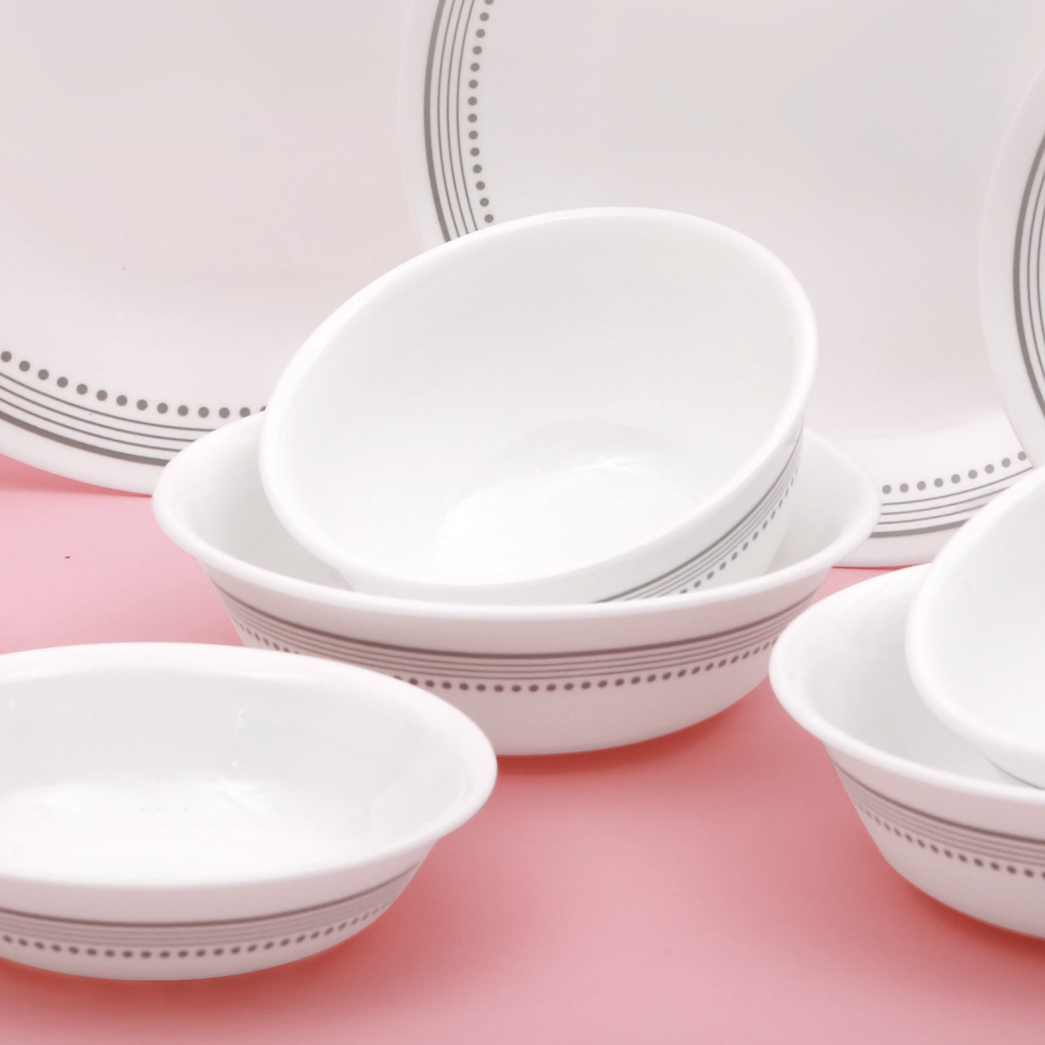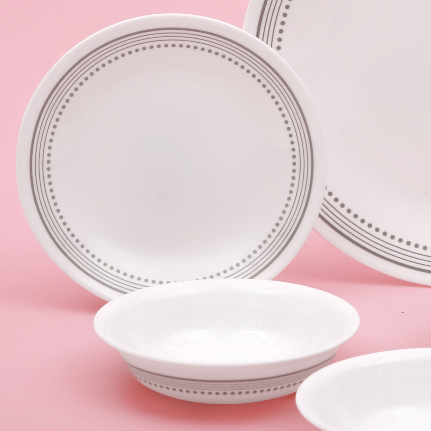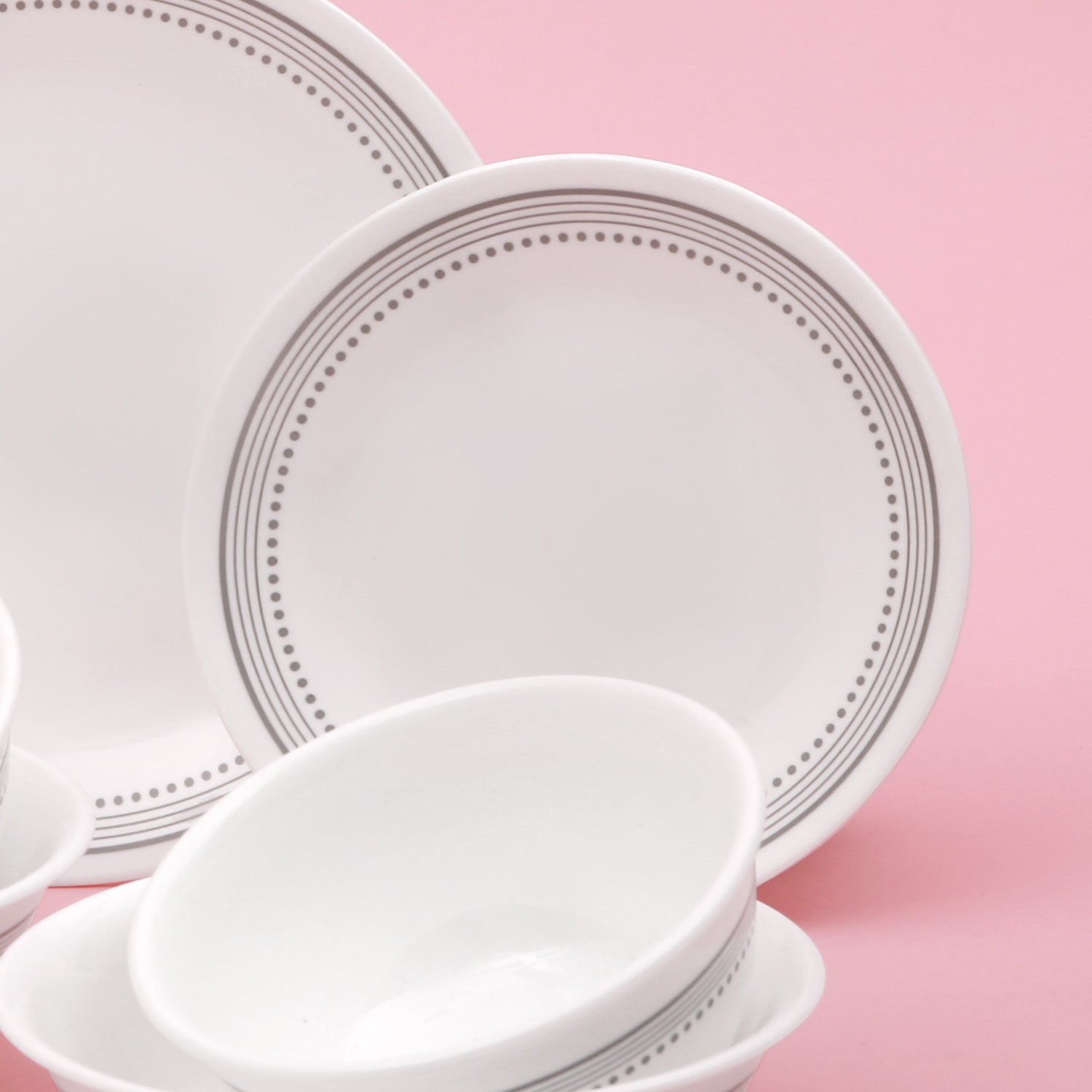 Enjoy a stylish dinner with Mystic Gray Corelle. Clean and modern brings luxury to the tableware. Any food will make your table stand out. The simple gray and white color combination will highlight the point of the kitchen interior.