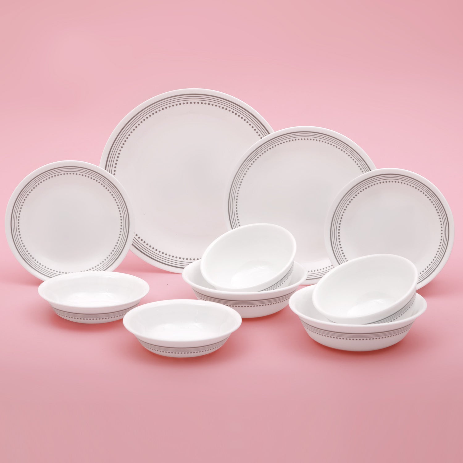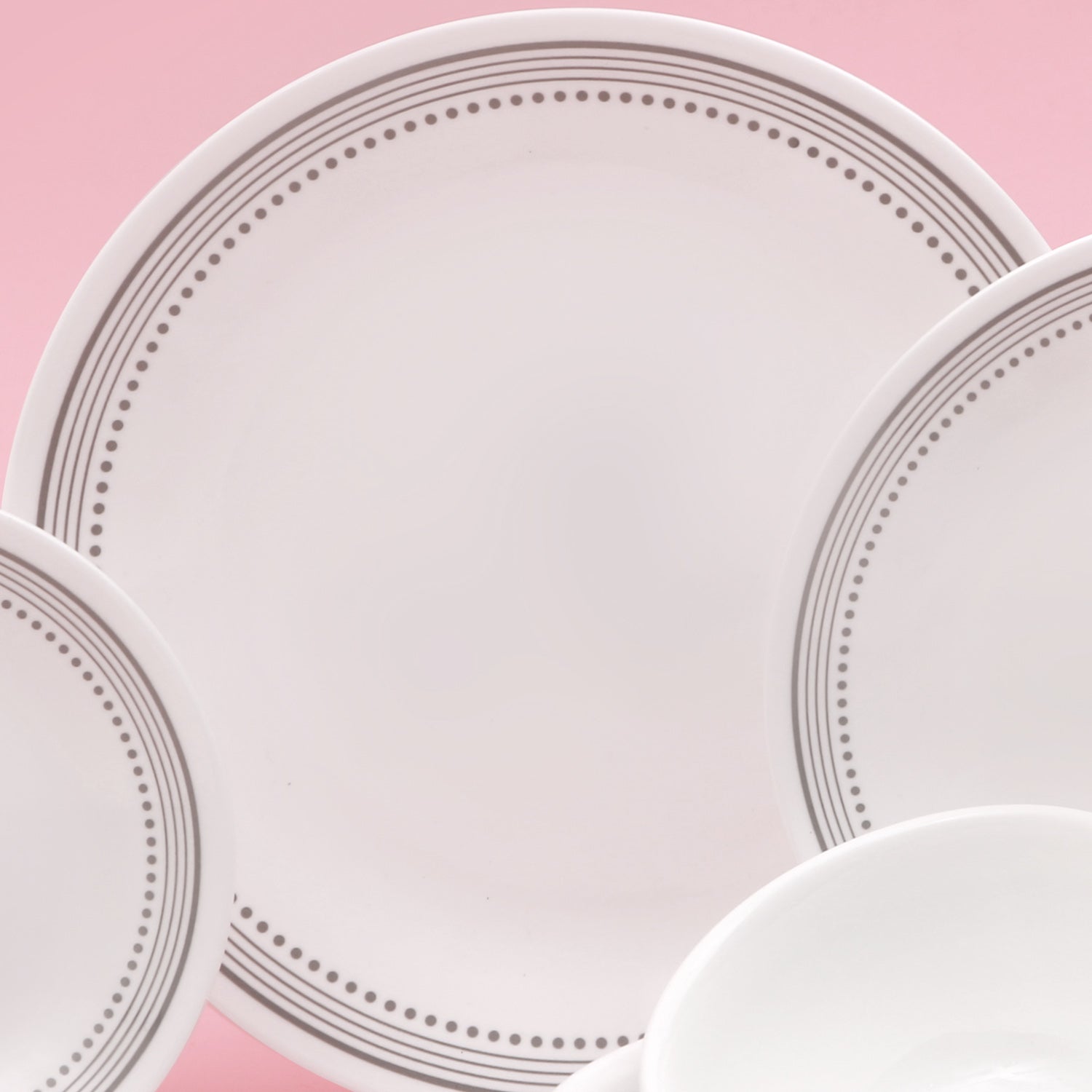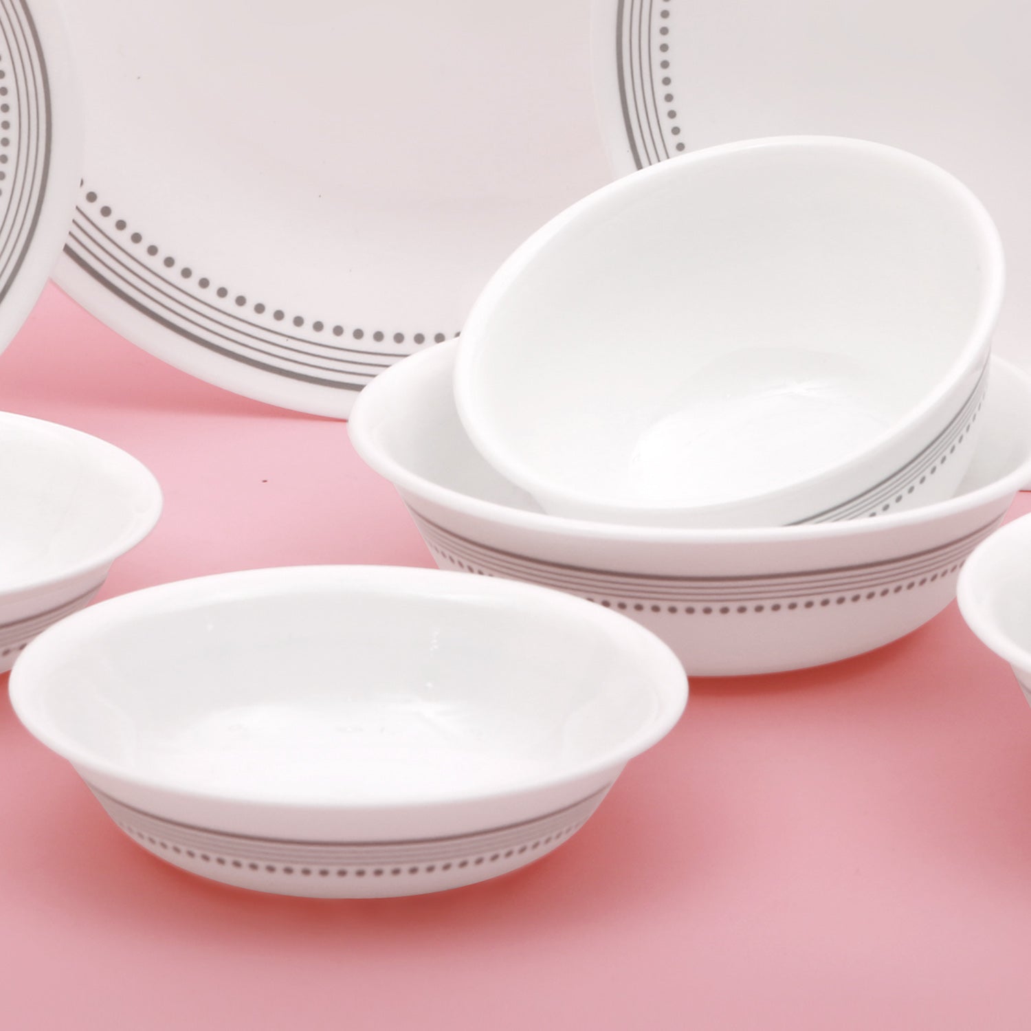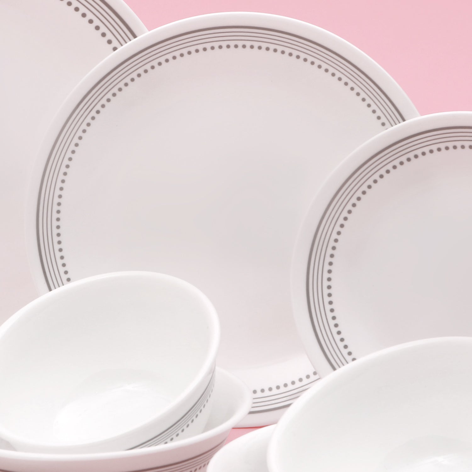 Enjoy a stylish dinner with Mystic Gray Corelle. Clean and modern brings luxury to the tableware. Any food will make your table stand out. The simple gray and white color combination will highlight the point of the kitchen interior.