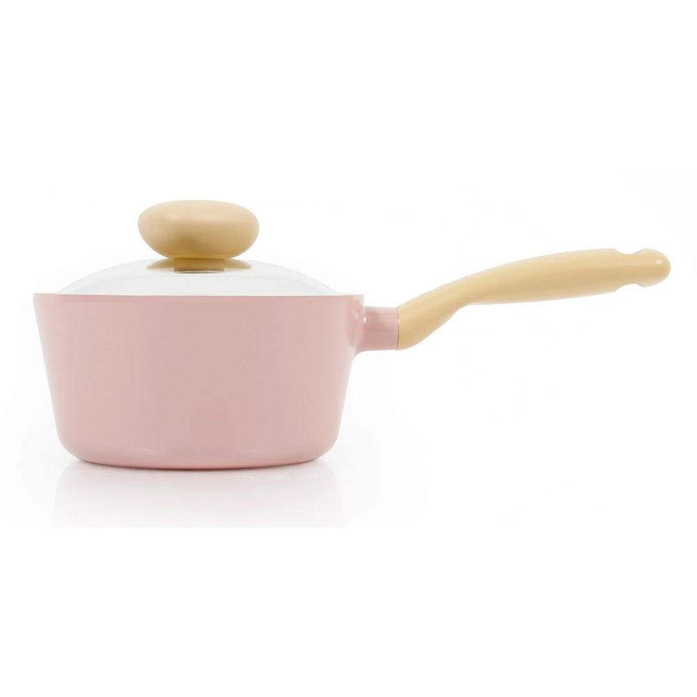 RETRO Cast Aluminum Ceramic Nonstick Saucepan (18cm) with Glass Lid Dishwasher Safe No PFOA Pink