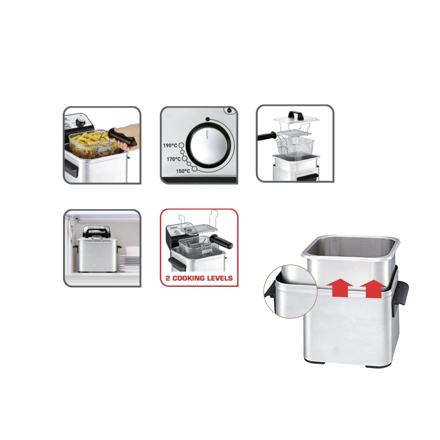 Easy to transport with its carrying handles Stainless steel housing and bowl for modern look Exclusive snack accessory to cook on 2 levels in the basket.