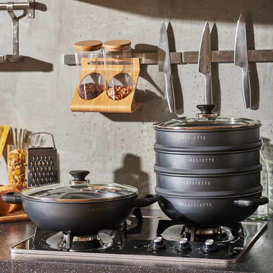 KANN 5-Layer Induction Wok Pan & Steamer (30cm) with Glass Lid Dishwasher Safe No PFOA Black
